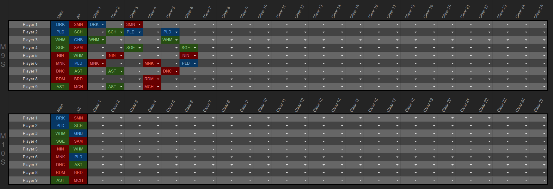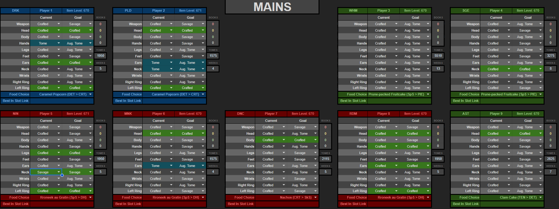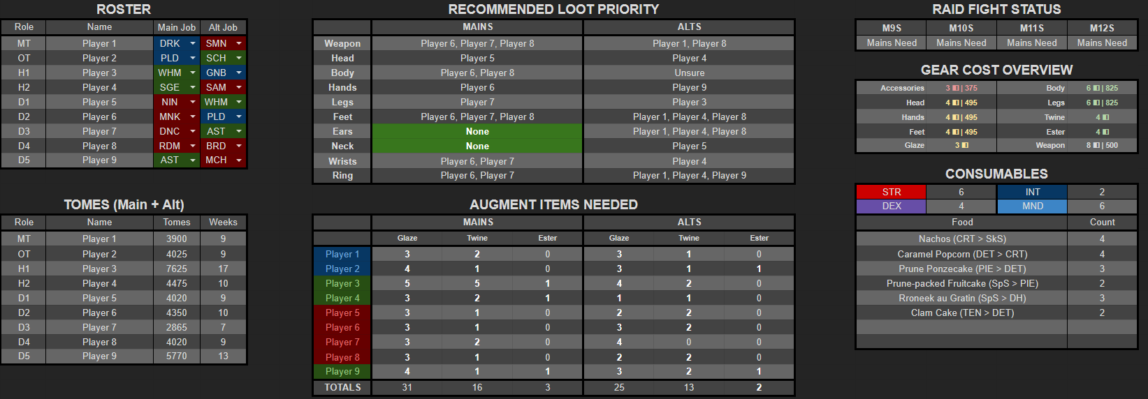 - Fully customizable 8 or 9-person roster with support for alt jobs. All gear, upgrades, tomestones, etc. are tracked.