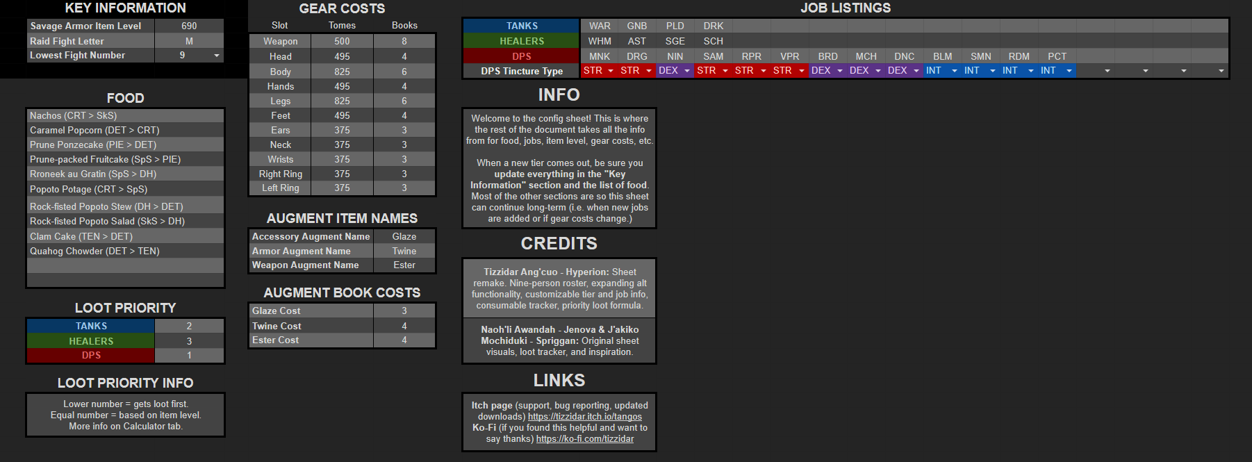 - All data (including jobs) is sourced from a configuration page, allowing this sheet to be reused for future tiers and expansions. Just update three values and the list of food and you're good to go!